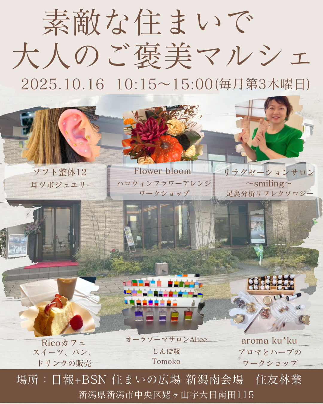 素敵な住まいで大人のご褒美マルシェ❤︎ 10月16日 新潟市中央区姥ヶ山 住まいの広場🏘️の住友林業さんにて 10:15~15:00開催です☺️ お家マルシェでカフェ🍰☕️もあるので リビングやダイニングでゆっくりくつろいだり はじめましての人とも会話を楽しめたり マルシェ出店ブースも毎月変わるので いつも新しい体験が待っていてとっても楽しみ💓...